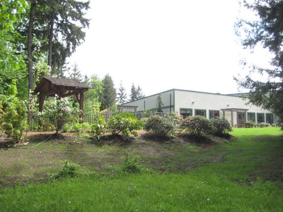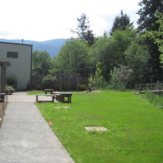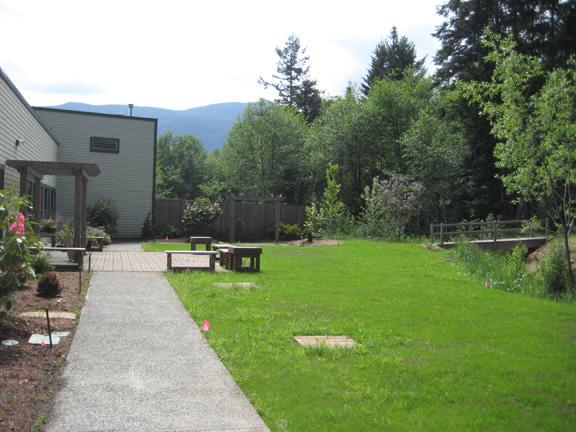 In 2007 the VIU horticulture students in HORT 131T, designed a garden that would be universally accessible and provide students and faculty with an outdoor lounge. This lounge acts as a hub or common gathering area for all who use the Paine Centre. The garden will accommodate 35 people for gatherings and celebrations. It is also available for students to use for lunch, breaks and games such as foot sac, croquet and boules. Areas of shade and sun will provide opportunities to enjoy the shoulder seasons while students are actively pursuing their studies.