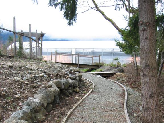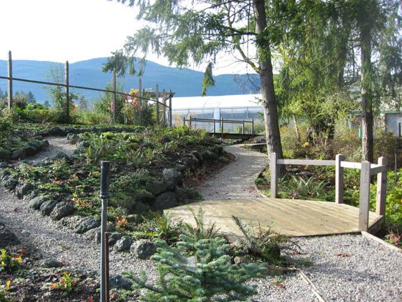 One of the challenges of gardening on Vancouver Island is to design for extensive rainfall most of the year as well as summer drought. The first consideration in the design of this garden was to deal with winter runoff and water conservation in the summer. Roof water and greenhouse runoff is collected and recycled through an artificial steam bed and pond system. The drainage system mimics a natural wetland and functions as a biological filter to clean the water exiting the site.